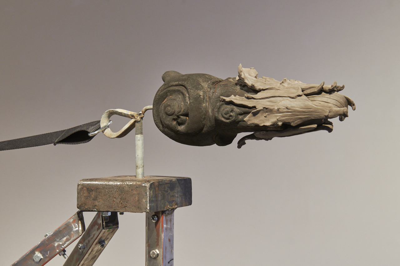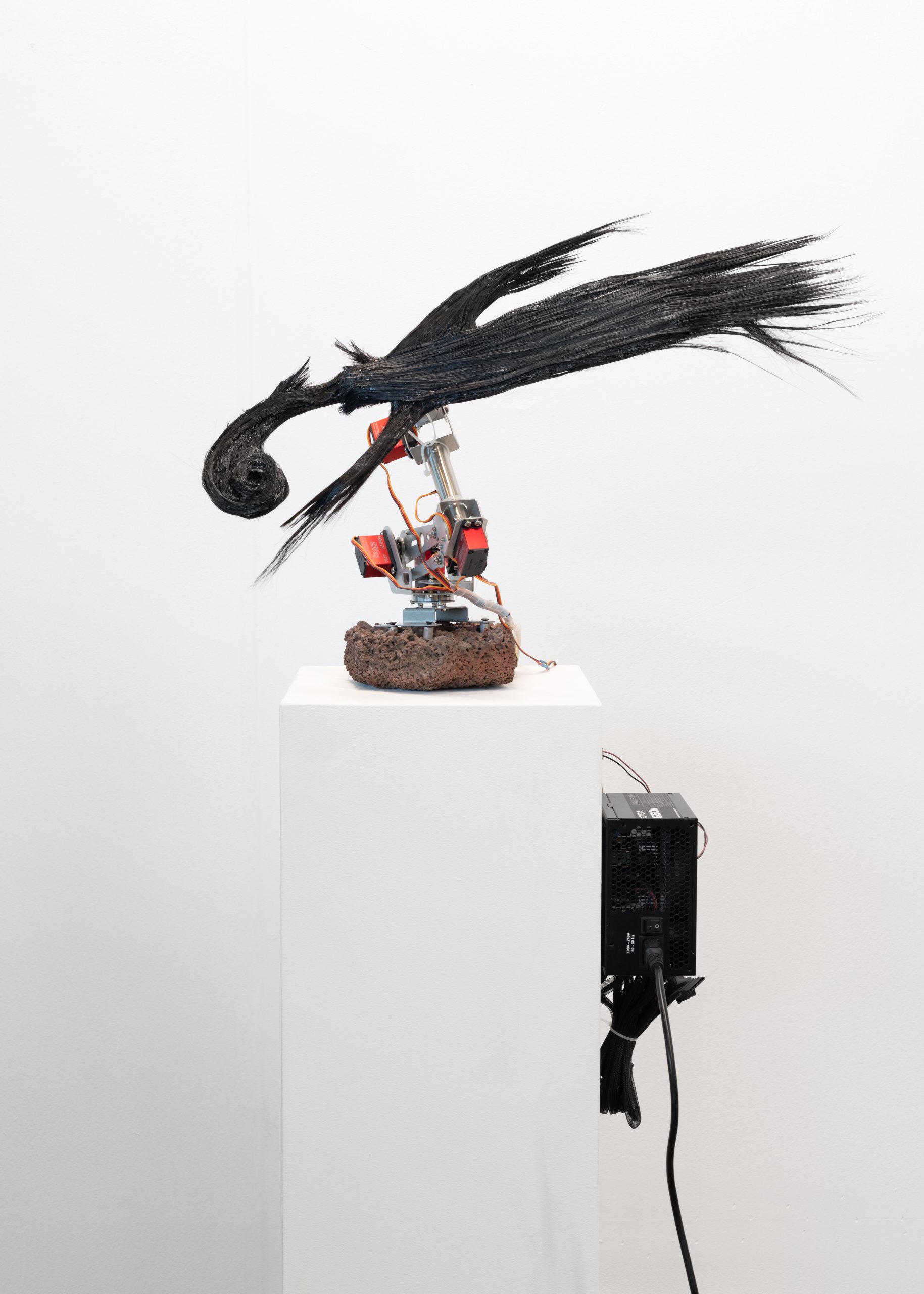 Samuel Guerrero, Fenómeno en el cielo, 2022. Resin, hair, robotic arm, 6 servos, volcanic rock, power supply, arduino board, cables, hardware. 90 x 60 x 30 cm (35.43 x 23.62 x 11.81 in)