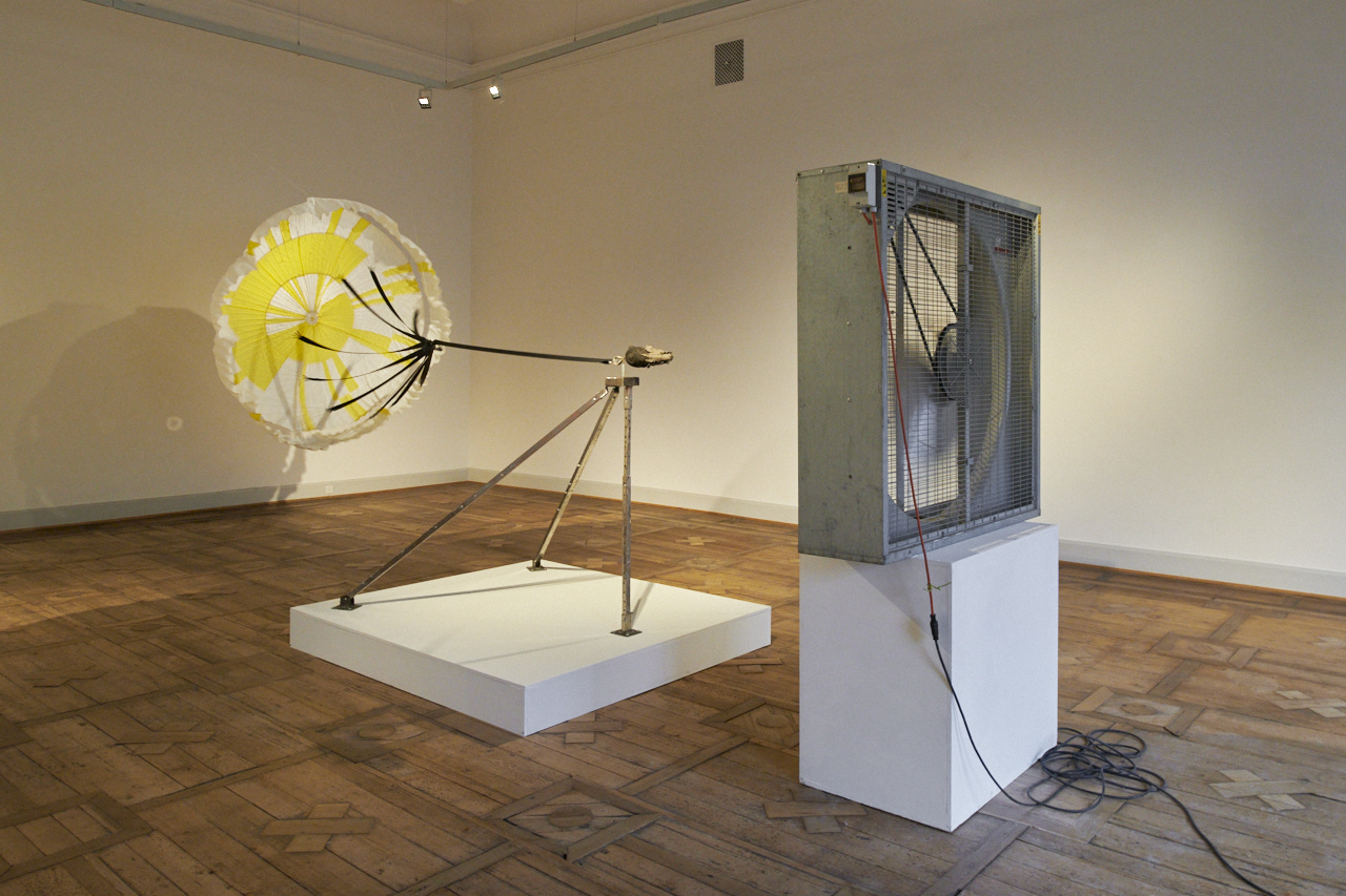 Samuel Guerrero, Estrella fugaz con paracaídas, 2022. Handmade parachute, metal, copal, wood, clay, industrial fan. 5 x 2 x 2 m.