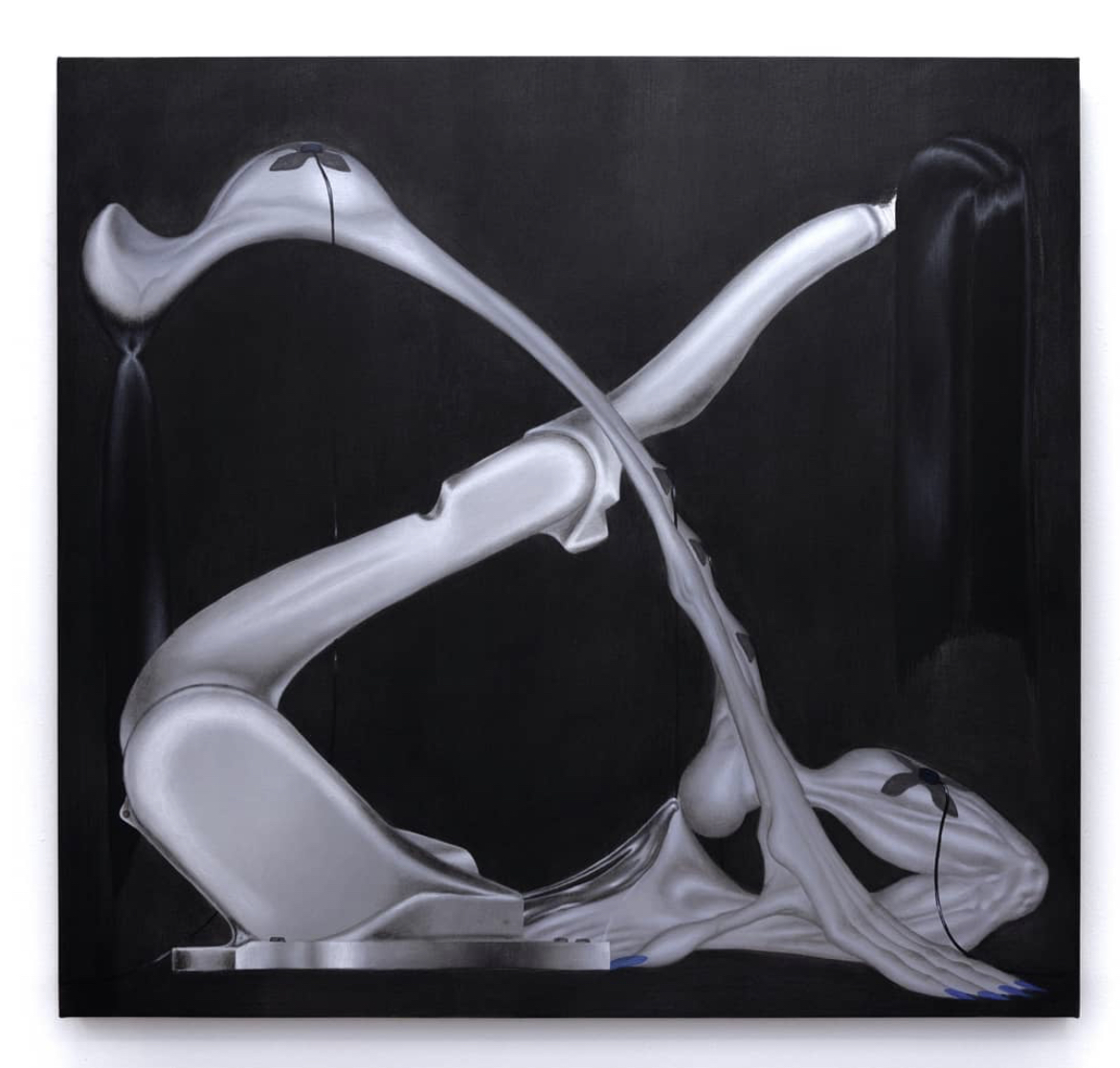 Samuel Guerrero, ¿Cuántas horas tengo que pasar en el gym para descubrir nuevas partes del cuerpo humano?, 2020. Acrylic on canvas with chromed steel frame. 132 x 93 x 4cm (56.36 x 36.61 x 1.57 in)