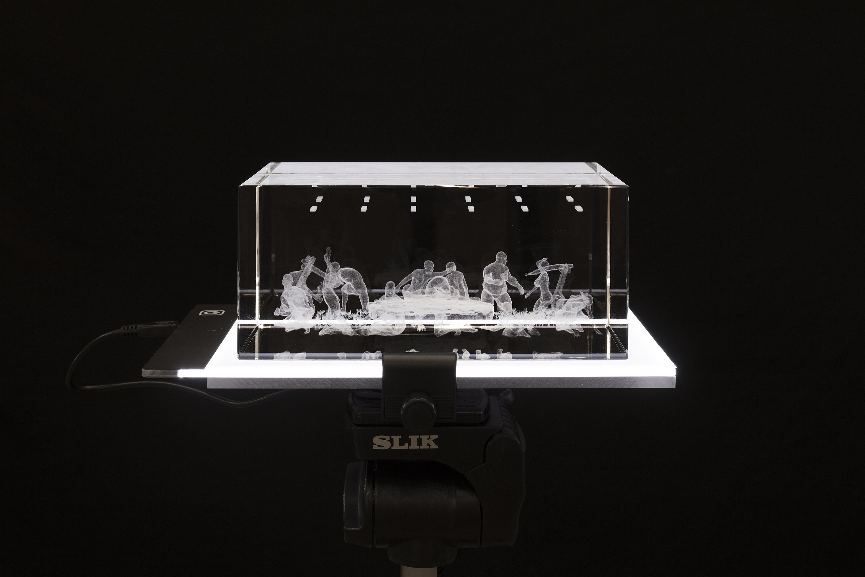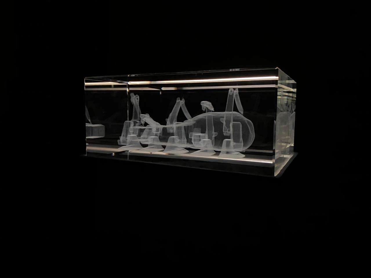 Samuel Guerrero, Brazos robóticos labrando cultura, 2020. 3-D engraving on glass. 12 x 18 x 8 cm. (4.72 x 7 x 3.14 in)