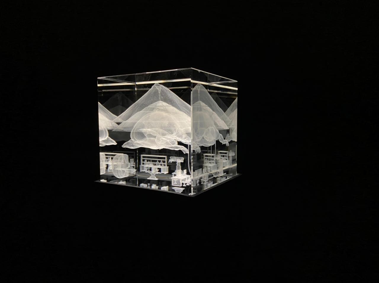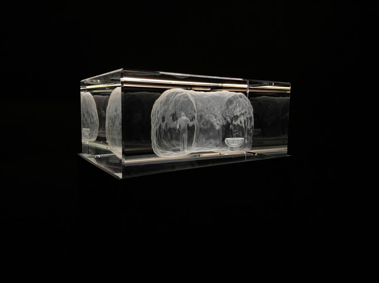 Samuel Guerrero, No me quites paz, 2020. 3-D engraving on glass 10 x 10 x 10 cm. (3.93 x 3.93 x 3.93 in)