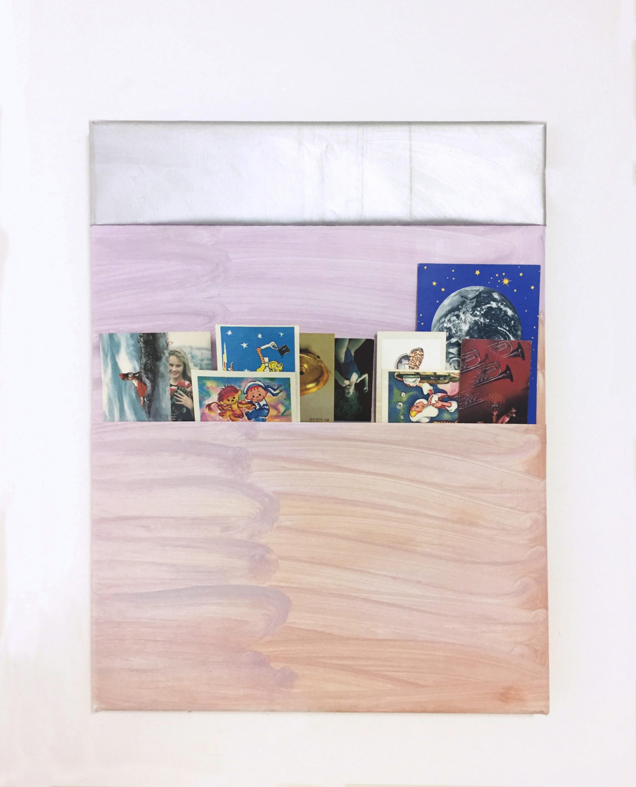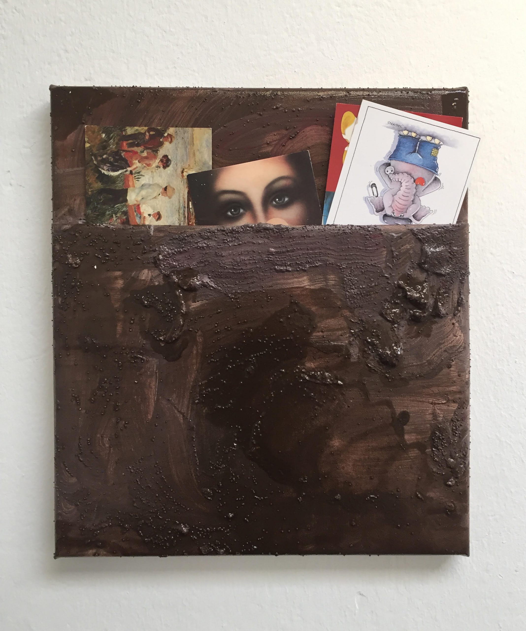 Sofia Berakha, Pocket Painting, 2019. Acrylic, postcards, stitching on canvas. 35 x 45 cm (13.77 x 17.71 in)