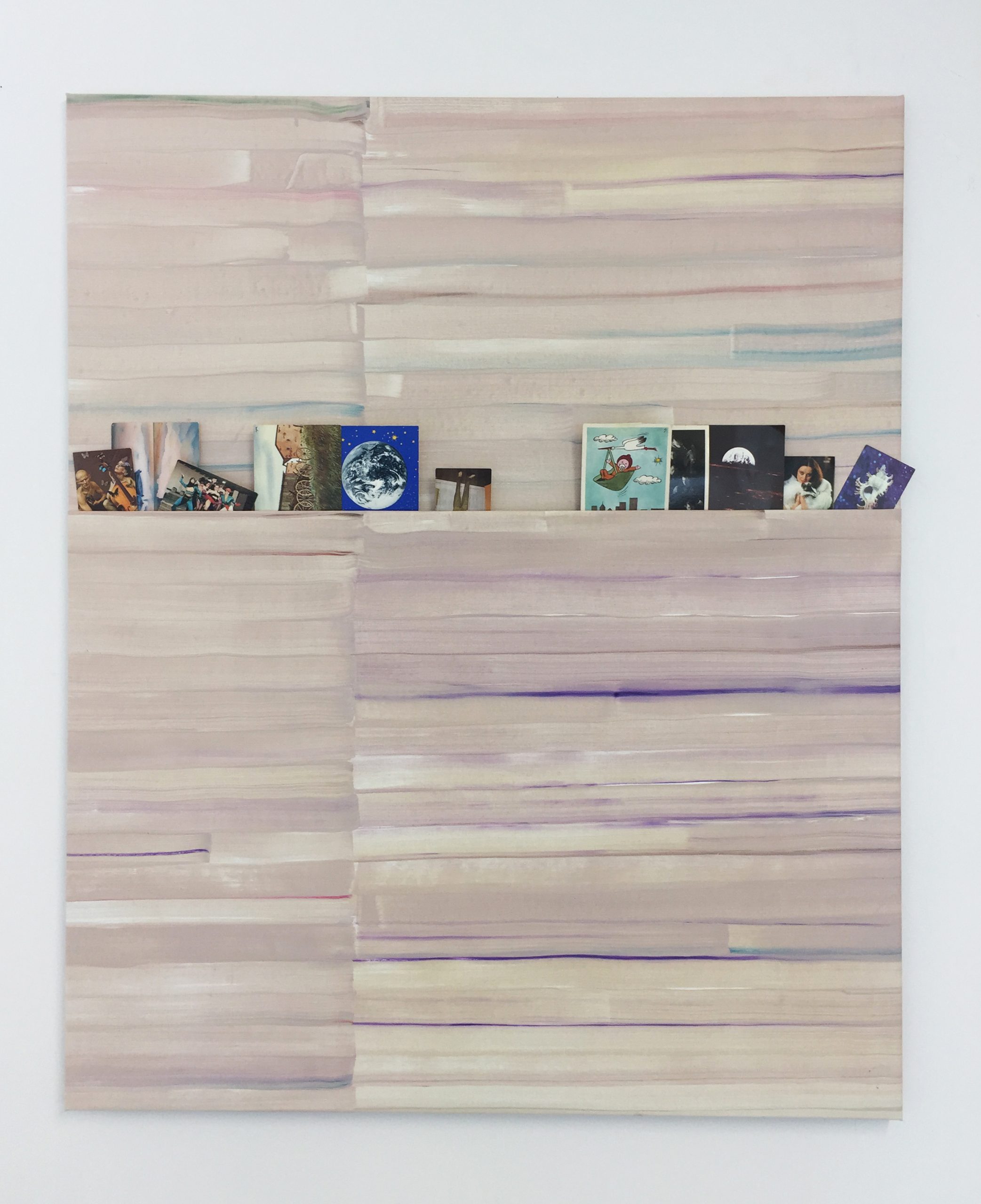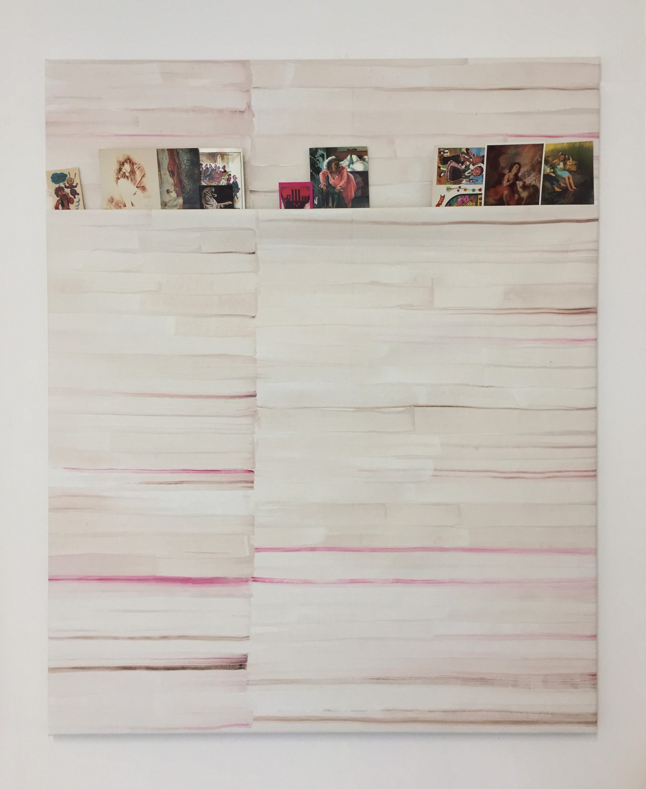Sofia Berakha, Pocket Painting, 2019. Oil, postcards, stitching on canvas. 70 x 180 cm (27.55 x 70.86 in)
