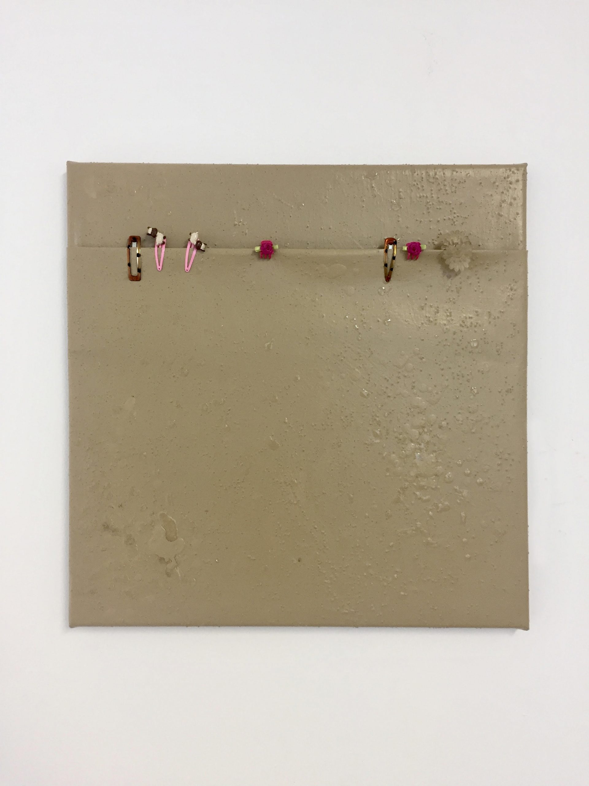 Sofia Berakha, Untitled, 2019. Acrylic, hair clips, on canvas. 45 x 45 cm (17.71 x 17.71 in)