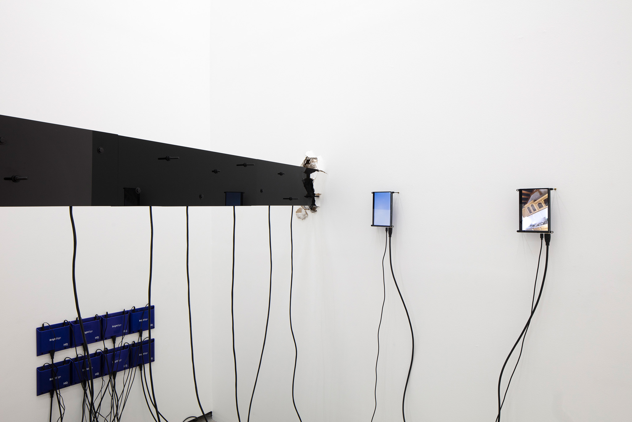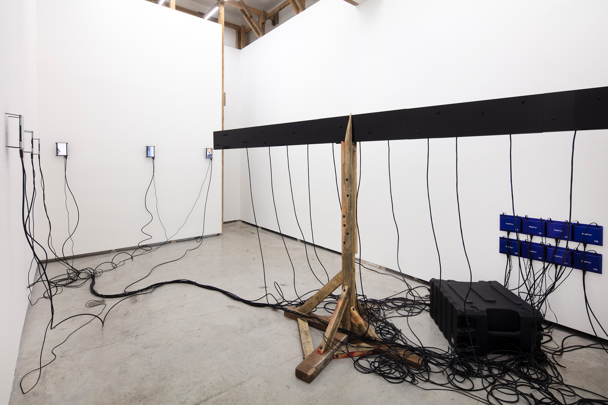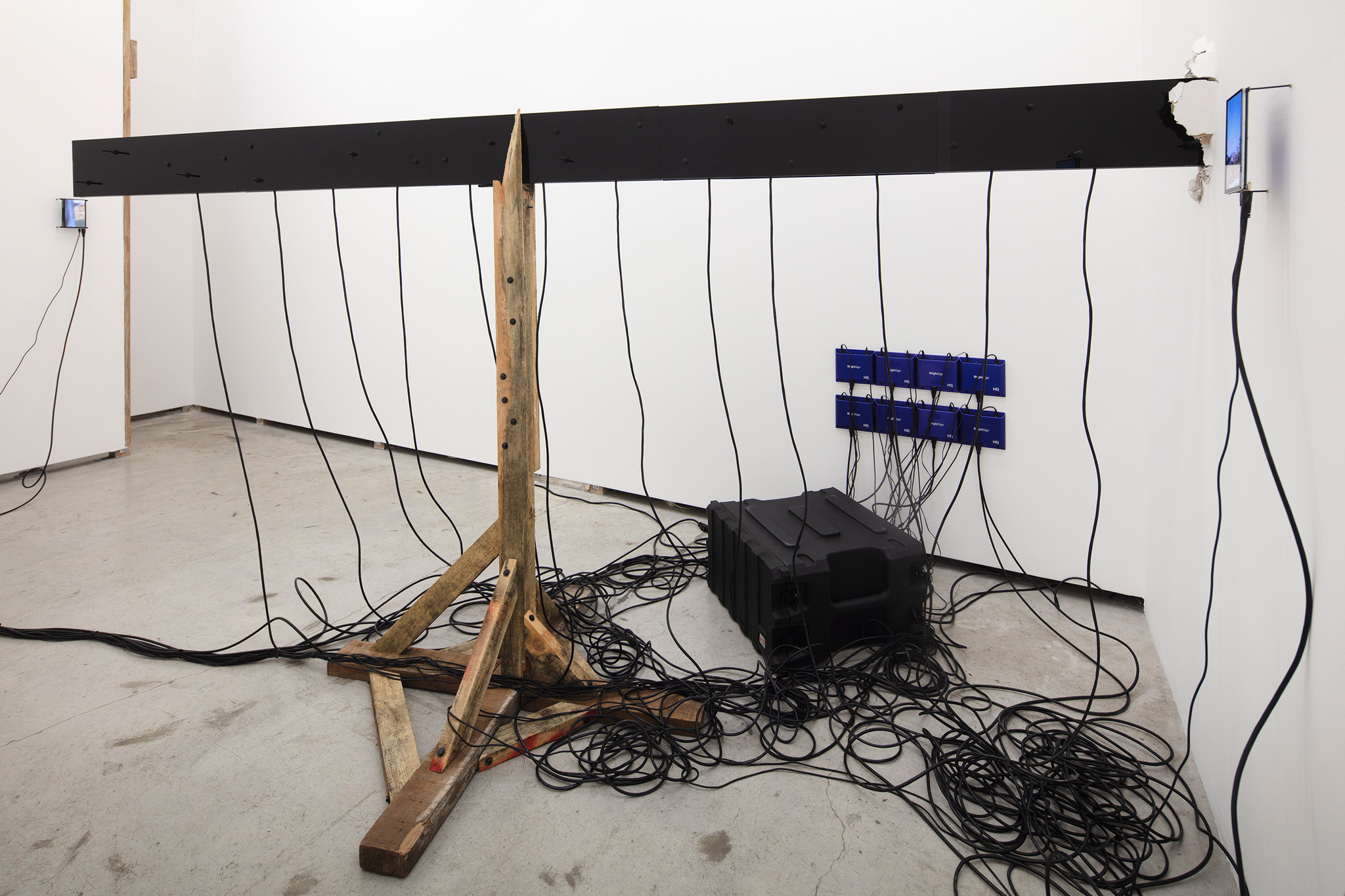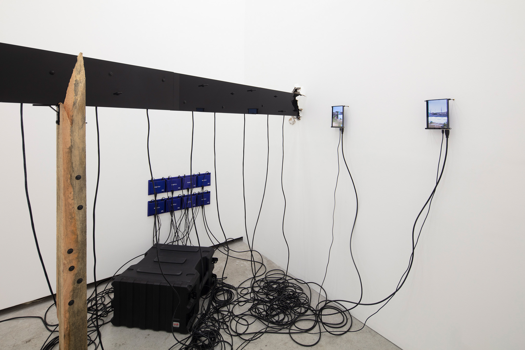 Multi-channel, site-responsive installation with reclaimed wood, glass panels, sixteen-channel sound interface with transducers, eight 7-inch monitors, eight network-connected BrightSign players, media rack, cabling.