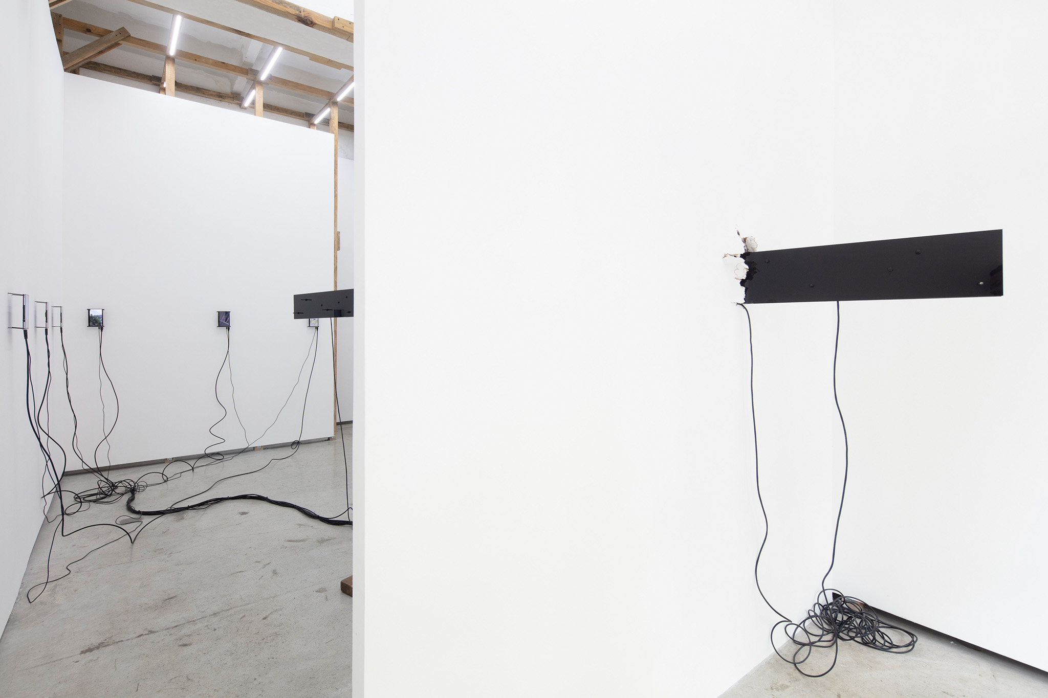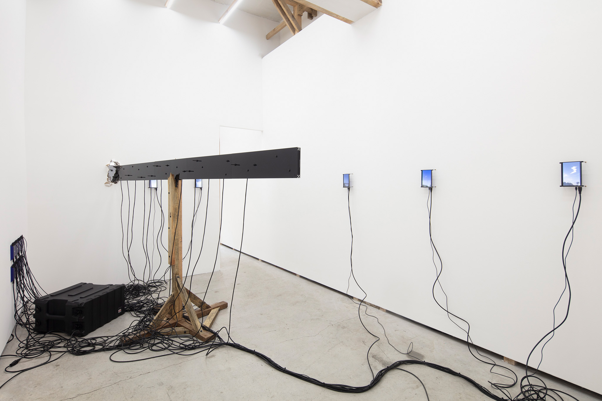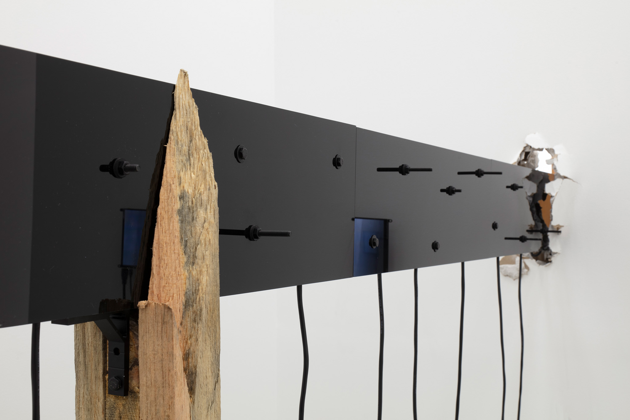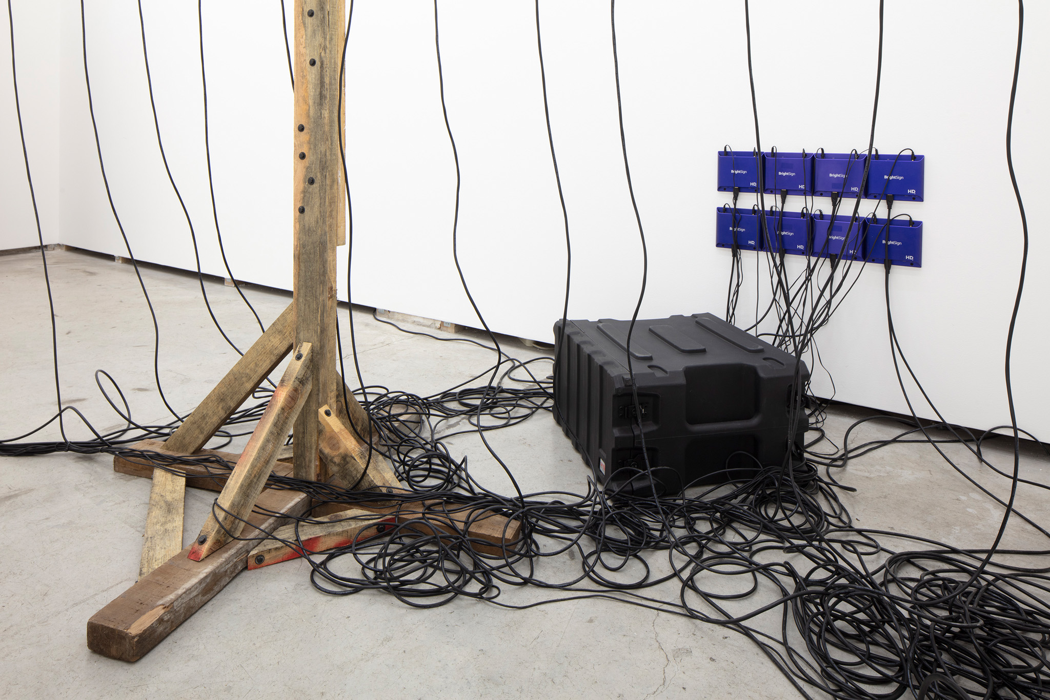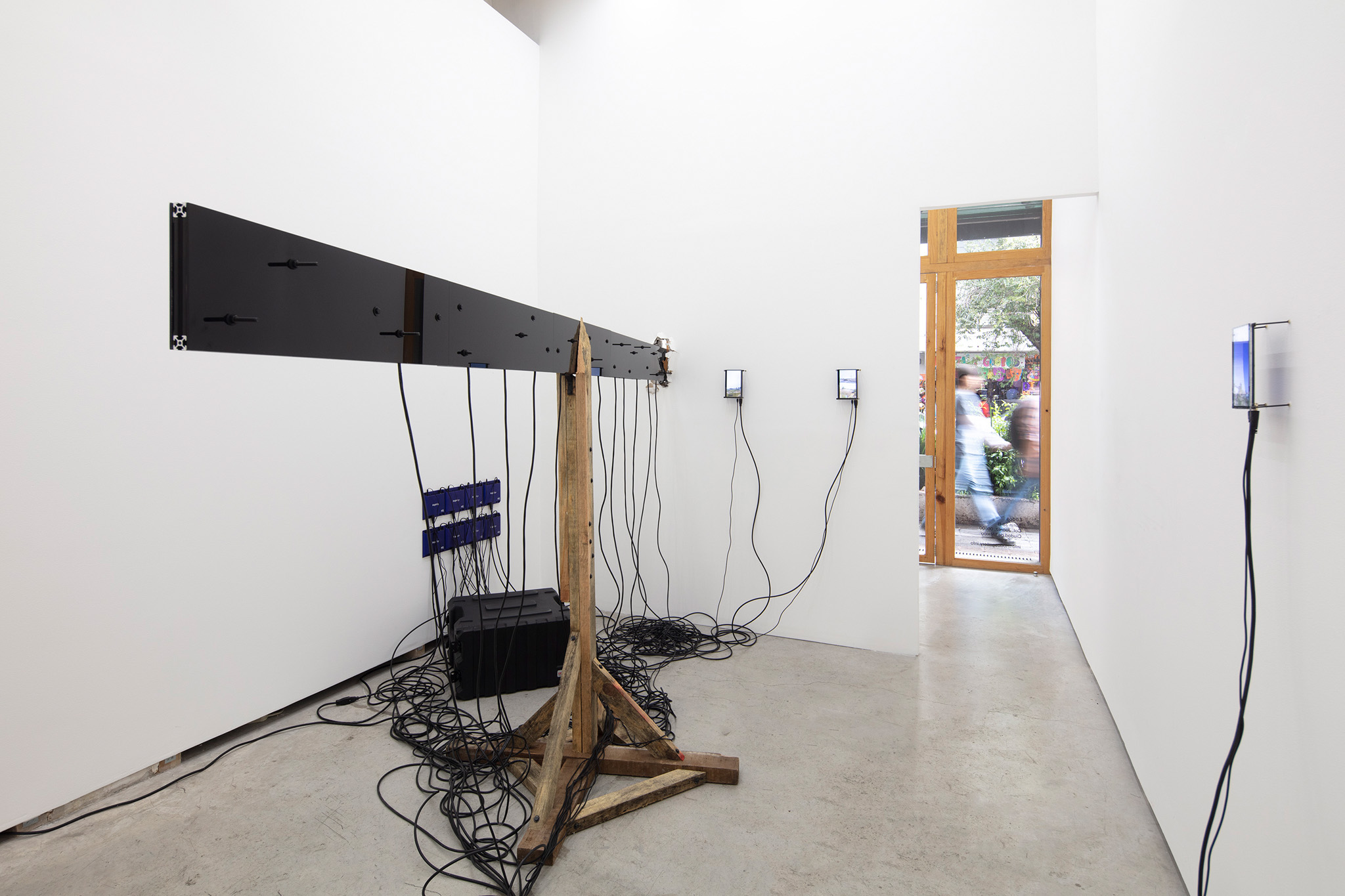 Multi-channel, site-responsive installation with reclaimed wood, glass panels, sixteen-channel sound interface with transducers, eight 7-inch monitors, eight network-connected BrightSign players, media rack, cabling.