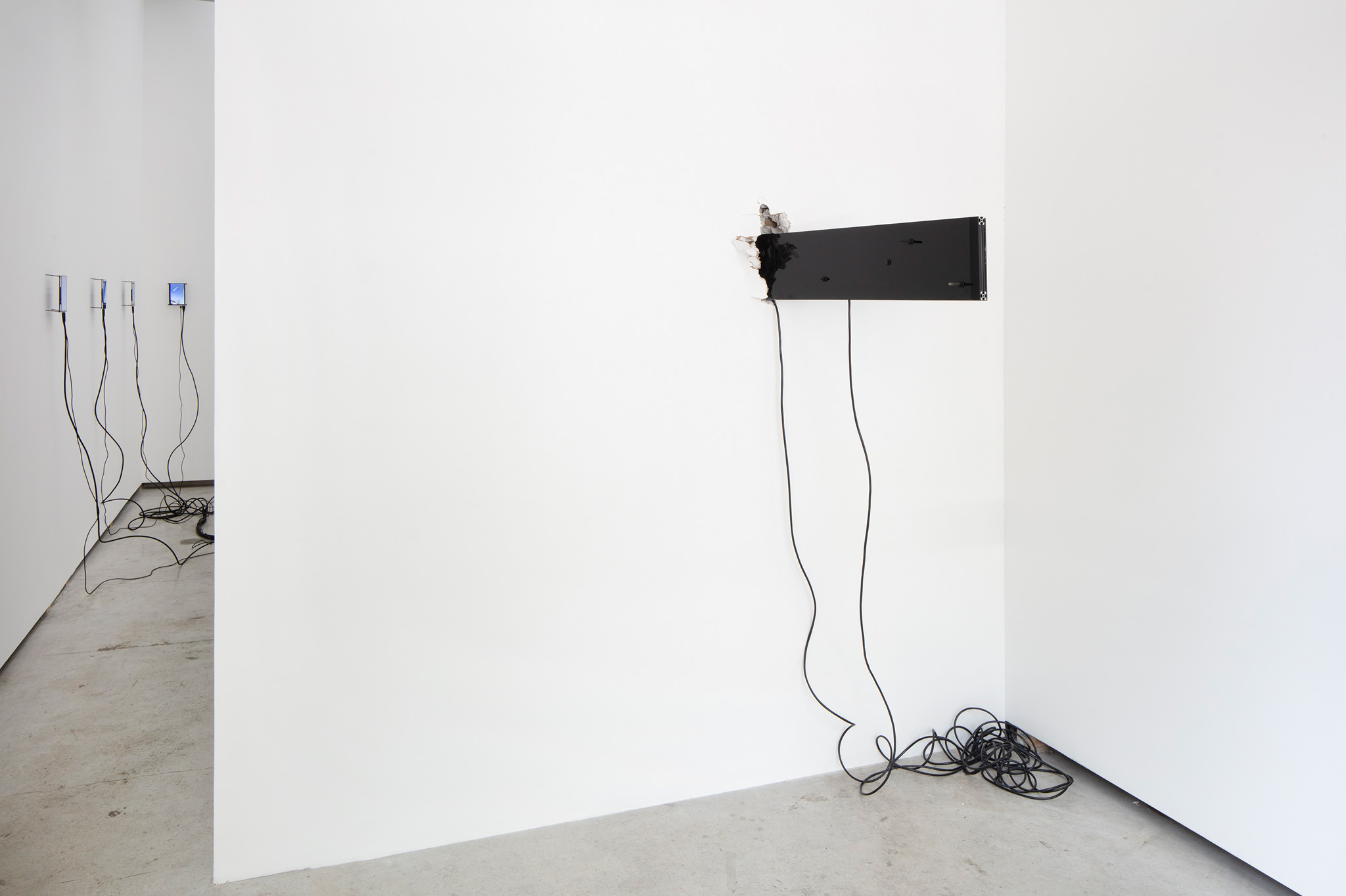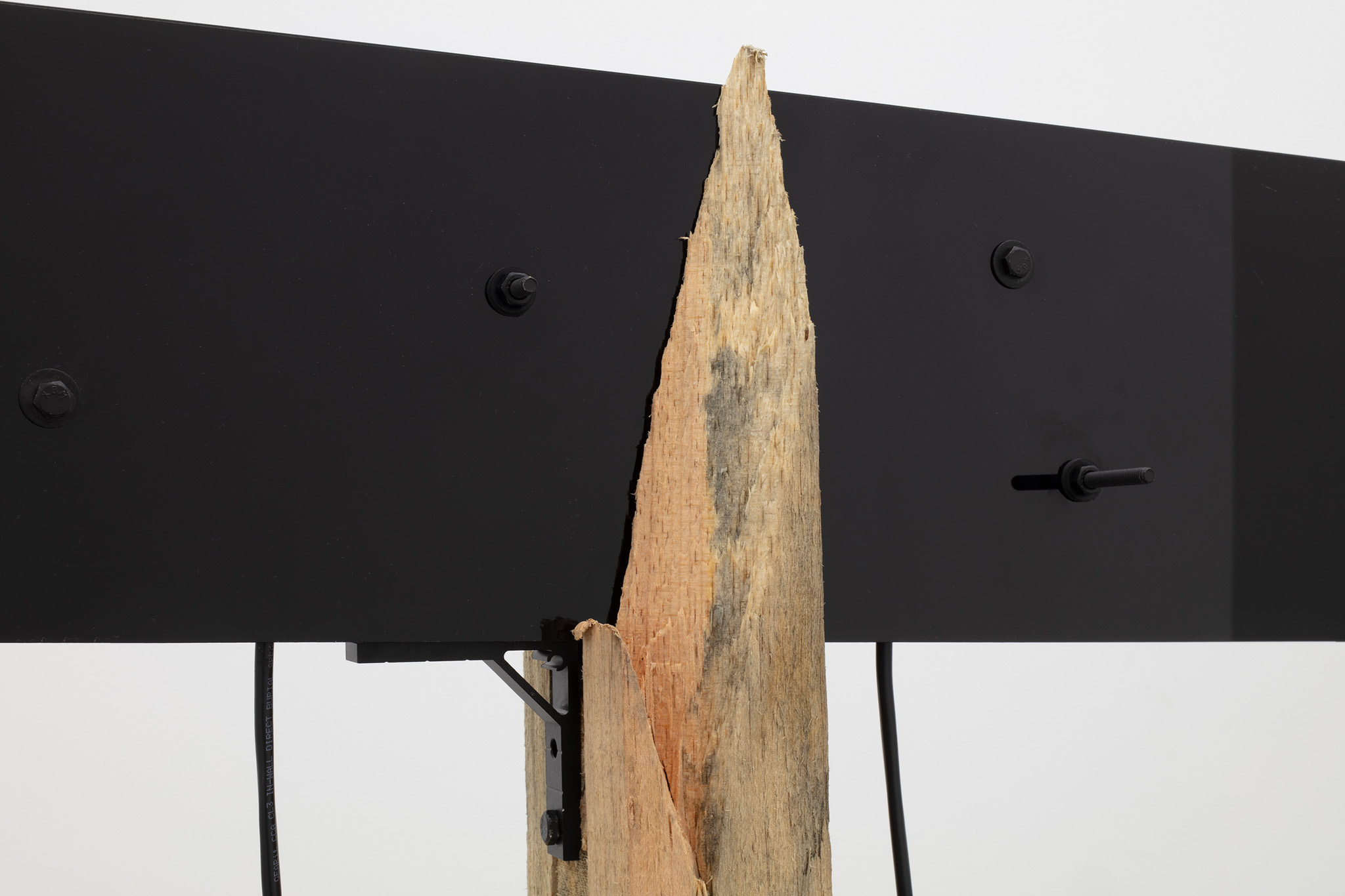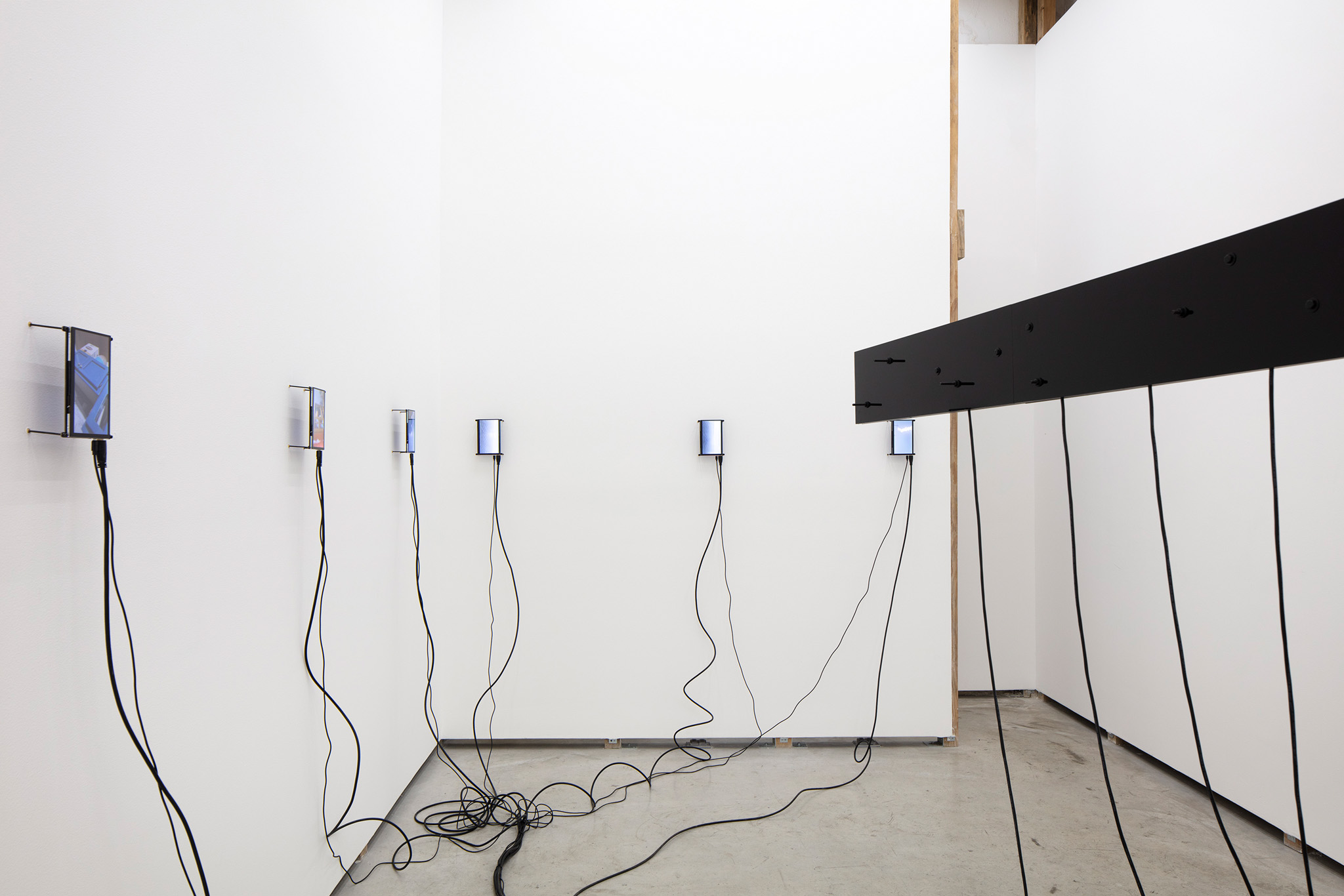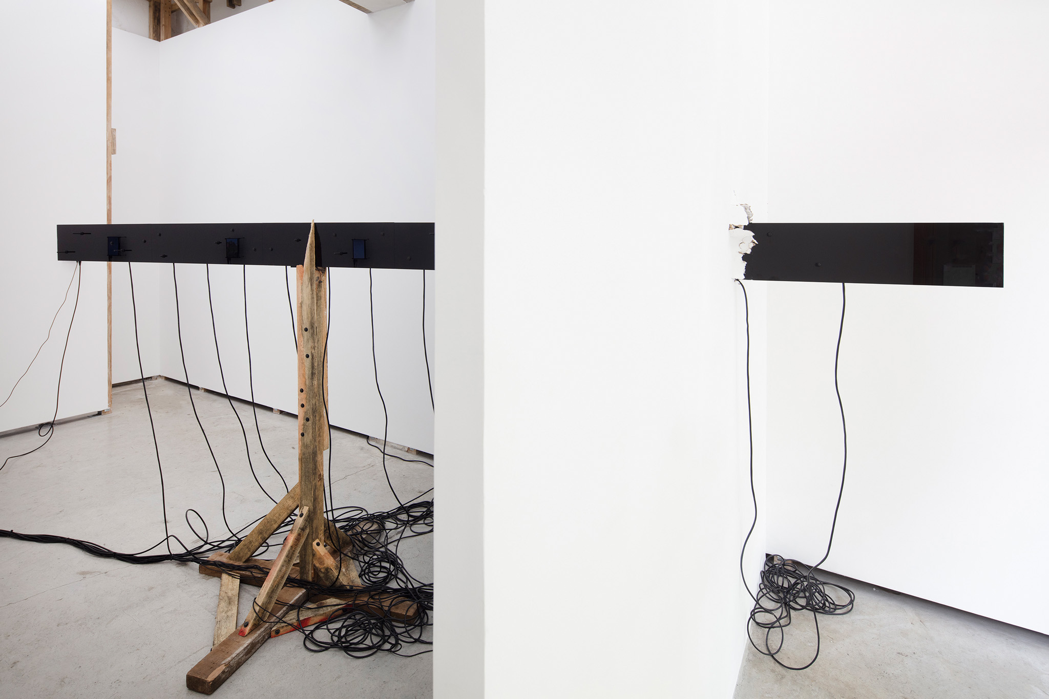 Multi-channel, site-responsive installation with reclaimed wood, glass panels, sixteen-channel sound interface with transducers, eight 7-inch monitors, eight network-connected BrightSign players, media rack, cabling.