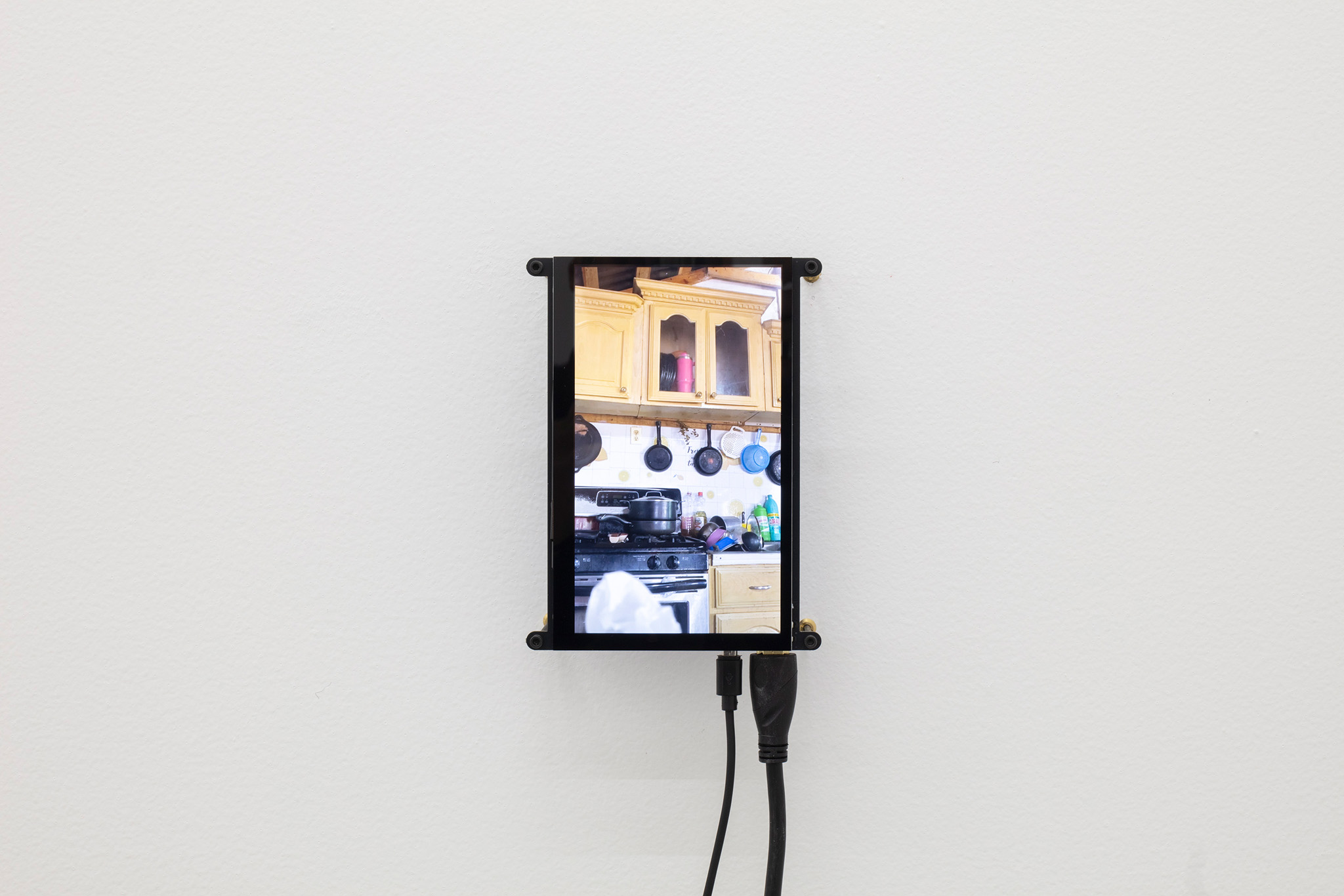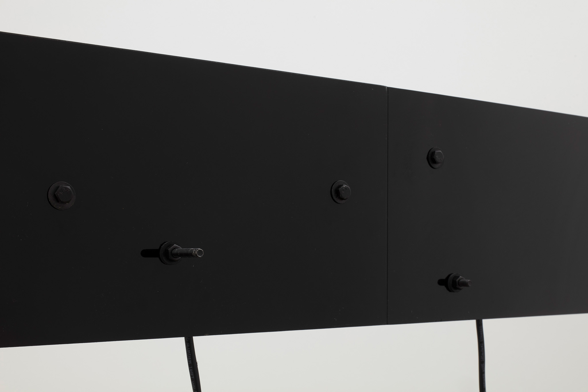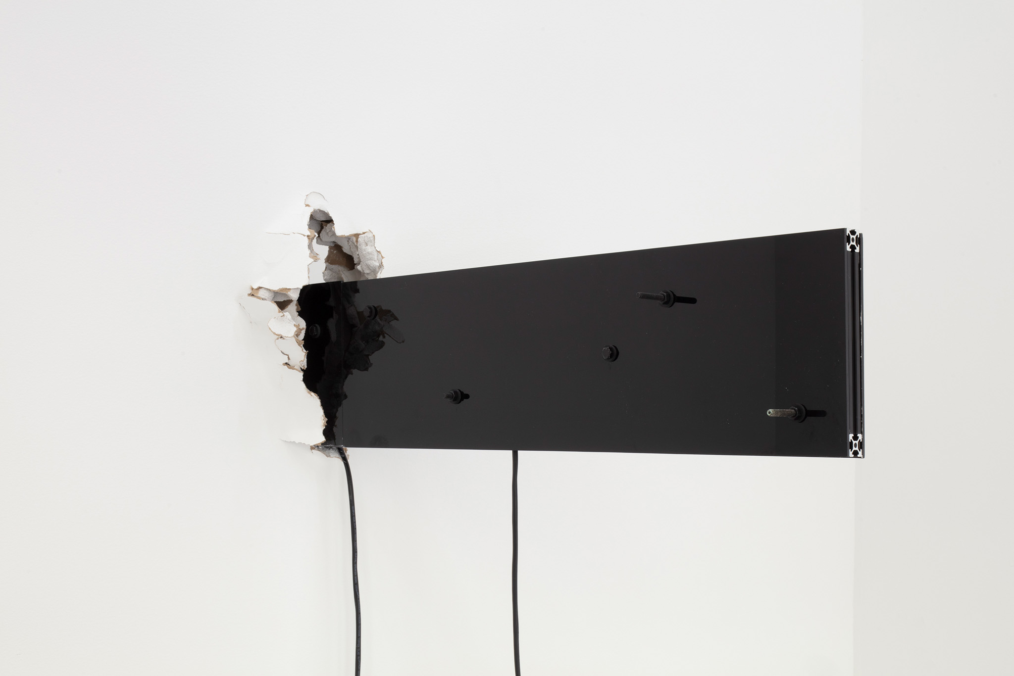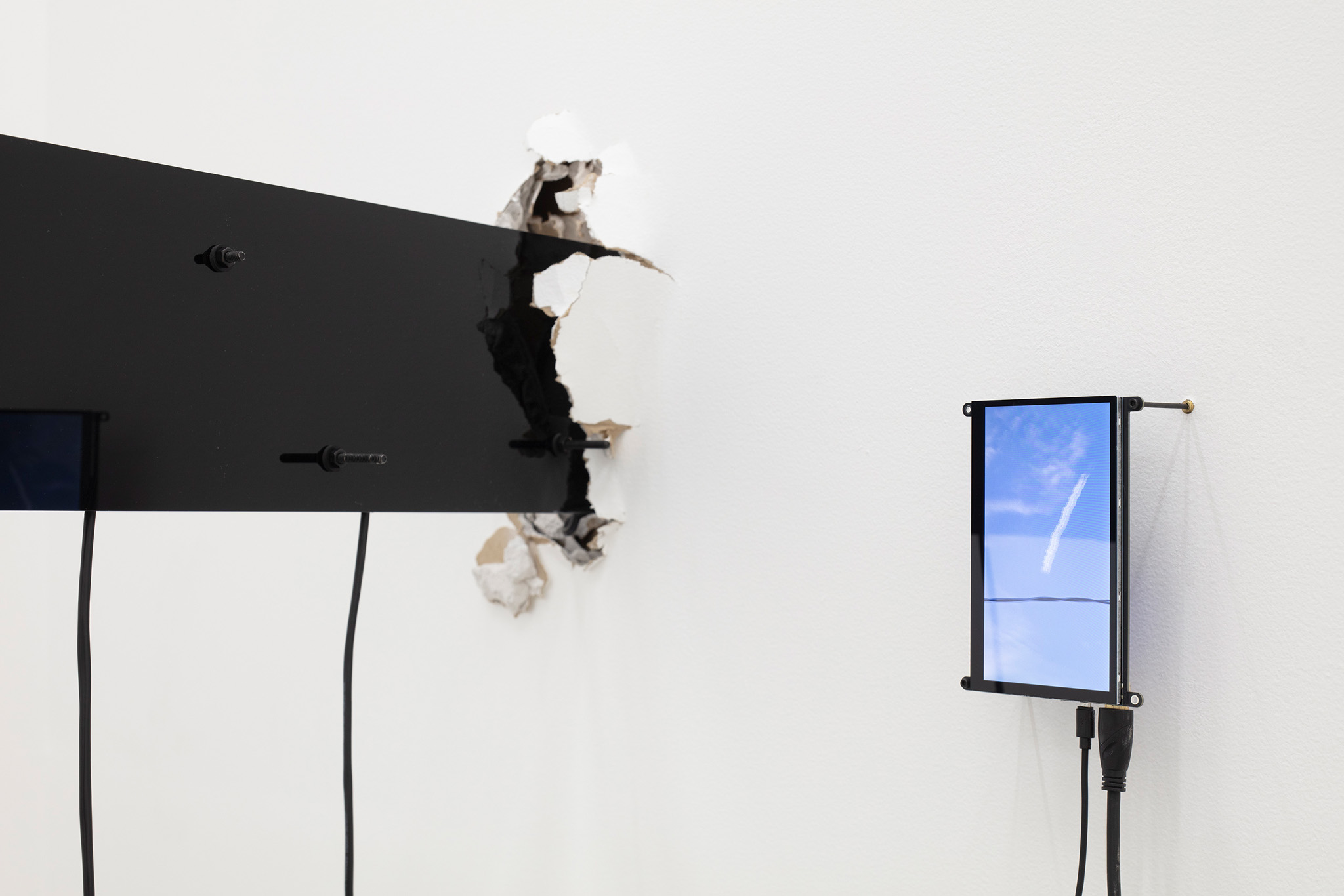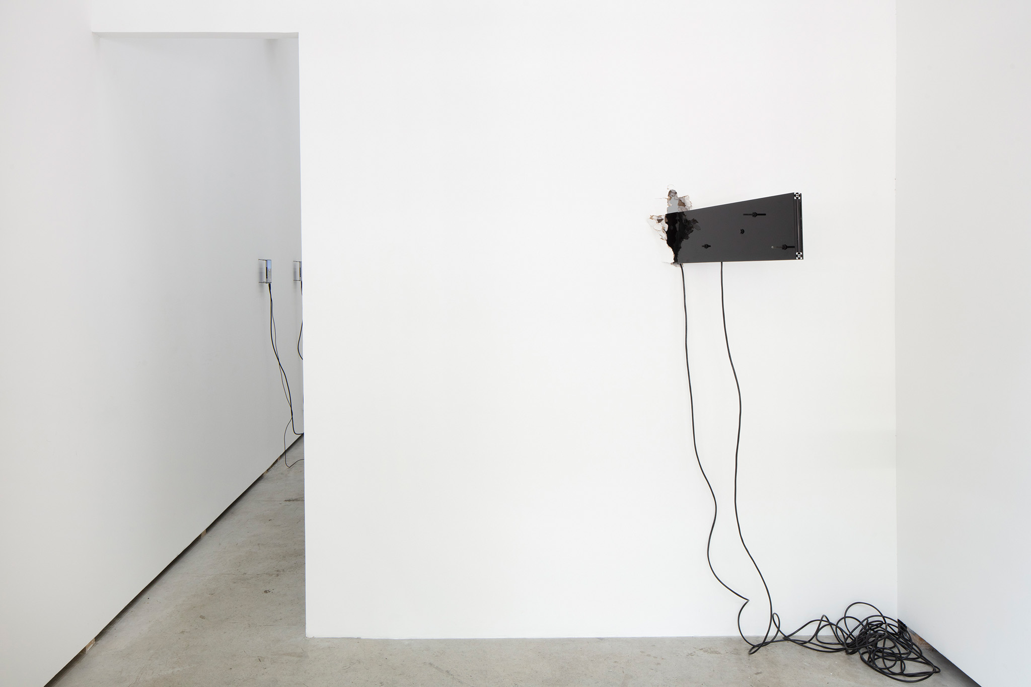 Multi-channel, site-responsive installation with reclaimed wood, glass panels, sixteen-channel sound interface with transducers, eight 7-inch monitors, eight network-connected BrightSign players, media rack, cabling.