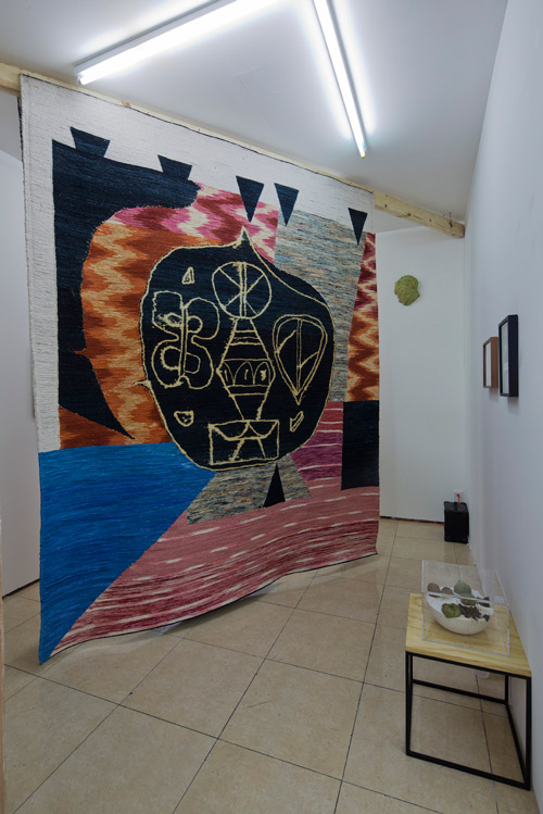 Yann Gerstberger, Not a Swiss Swatch, 2016. Cotton yarn dyed with cochineal extract and synthetic dyes sewn onto reclaimed vynil banner. 240 cm x 290cm.