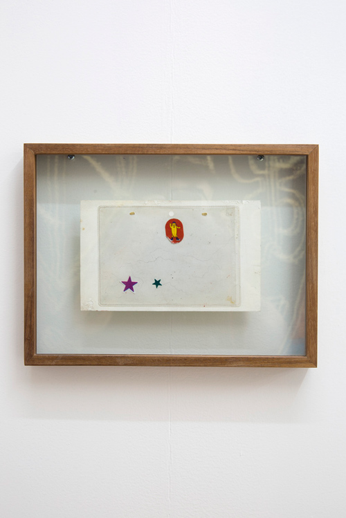 Diego Salvador Rios, Club de las afinidades (Affinity Club), 2016. Drawing on paper, sewn plastic envelope, stickers, with wooden frame. 25cm x 33cm x 3.5cm