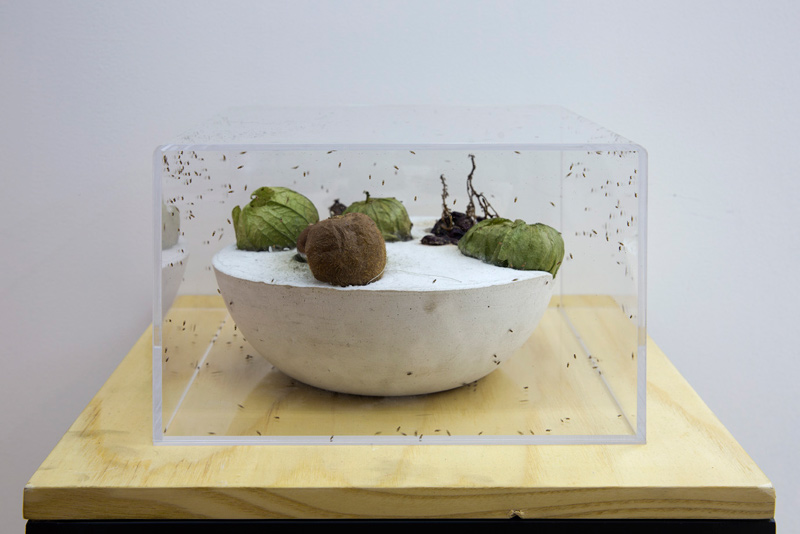 Oa4s, Fruitbowl, 2015. Fruit, plaster, fruit flies, acrylic box. 40cm x 40cm x 30cm