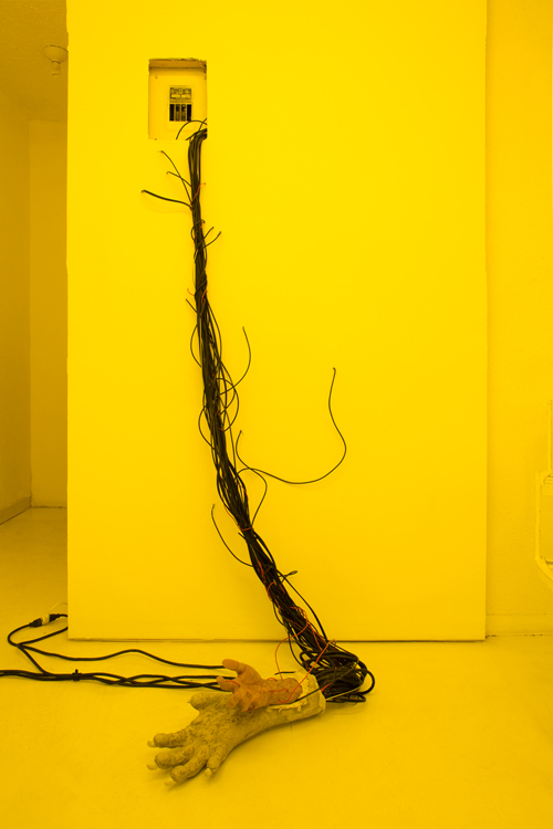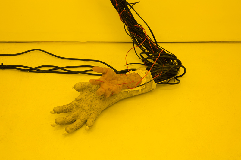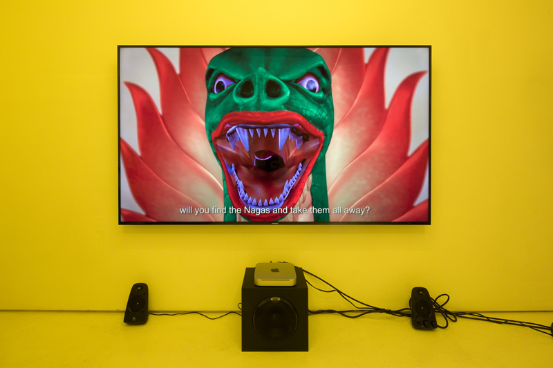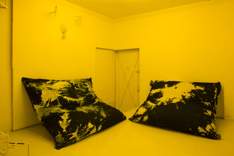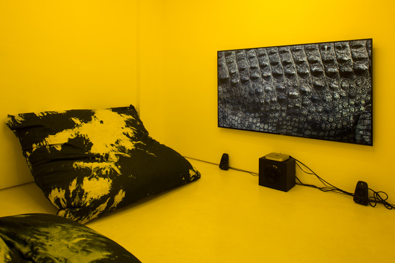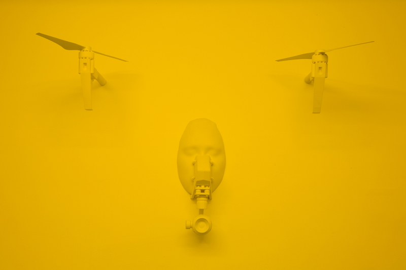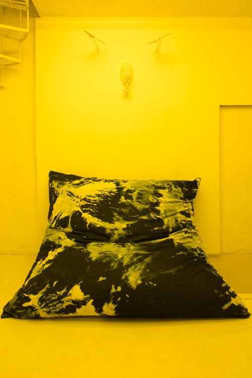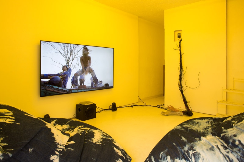 Dear Chantri, the you of the future may collect the us in the present maybe decide to call it a history put it in a room filled with people and give them all funny names, 2016. Installation composed of an exhibition copy of HD-video "Painting with History in a Room Filled With People With Funny Names 3", 75 inch TV, egg yolk yellow light gels, two denim pillows, 3D printed drone mask, cement and sillicone. Overall dimensions variable.