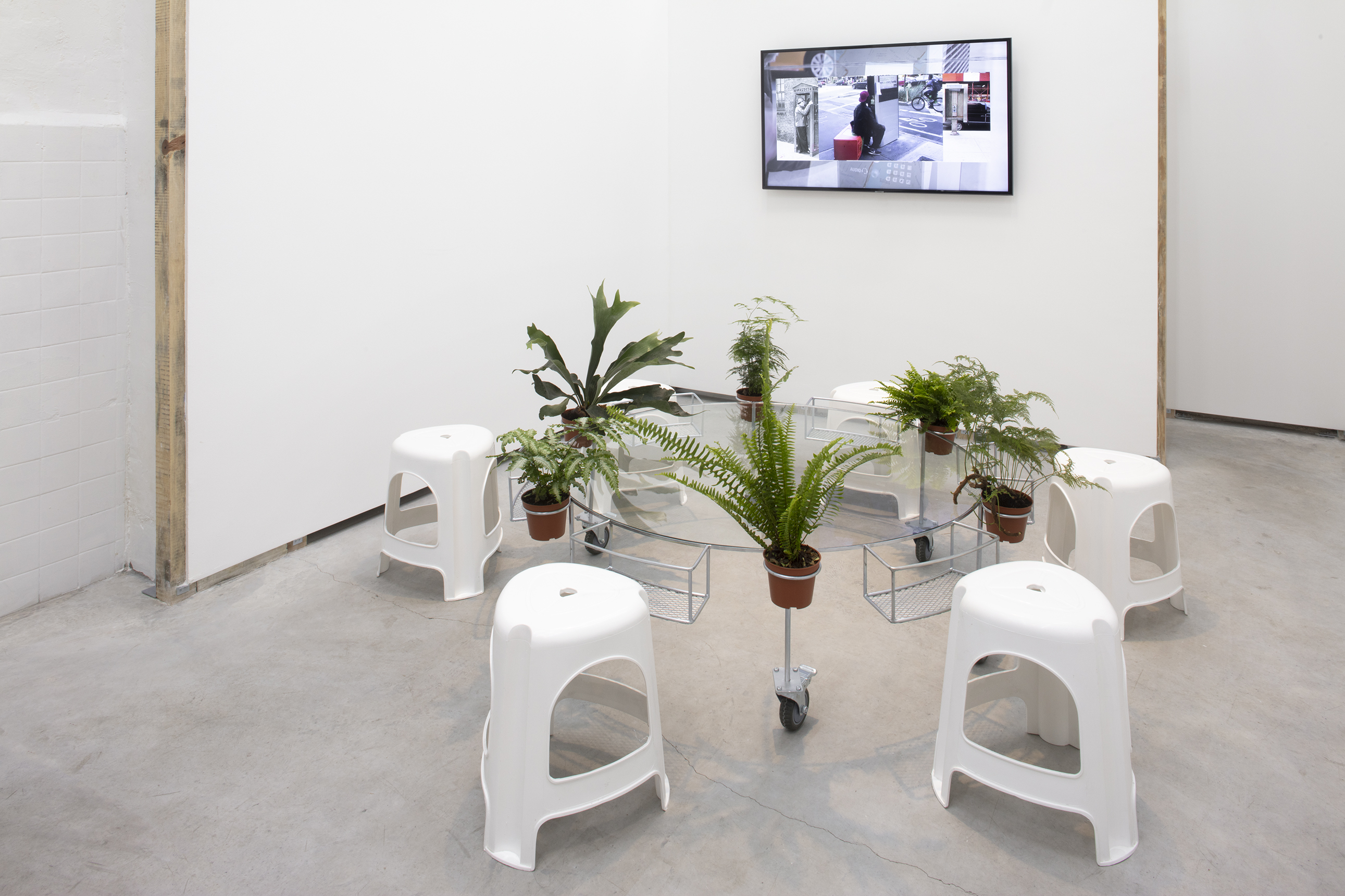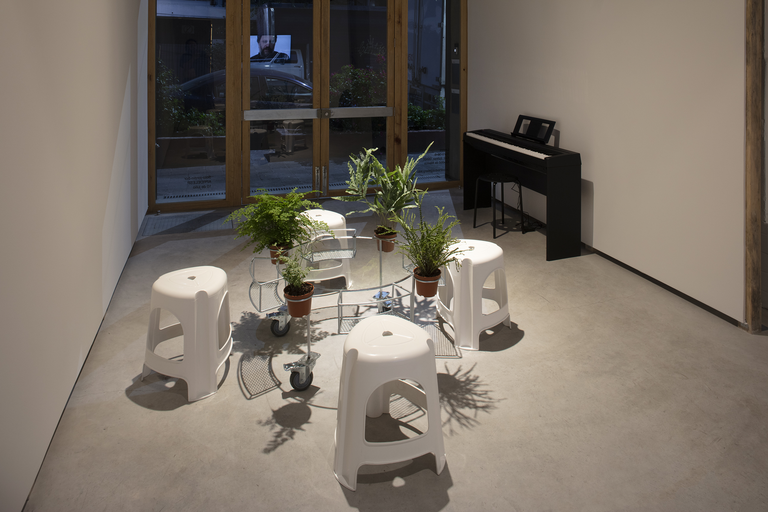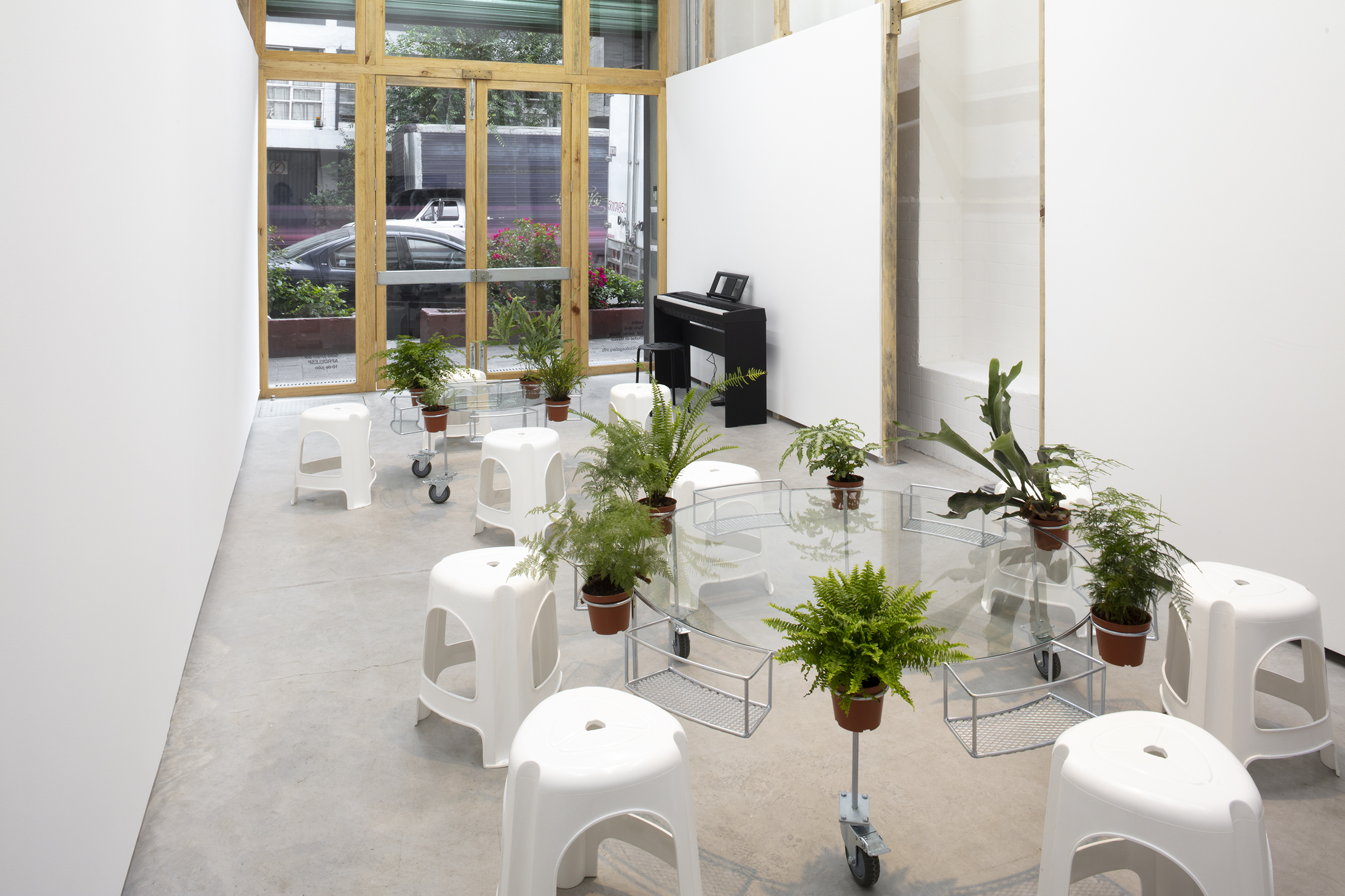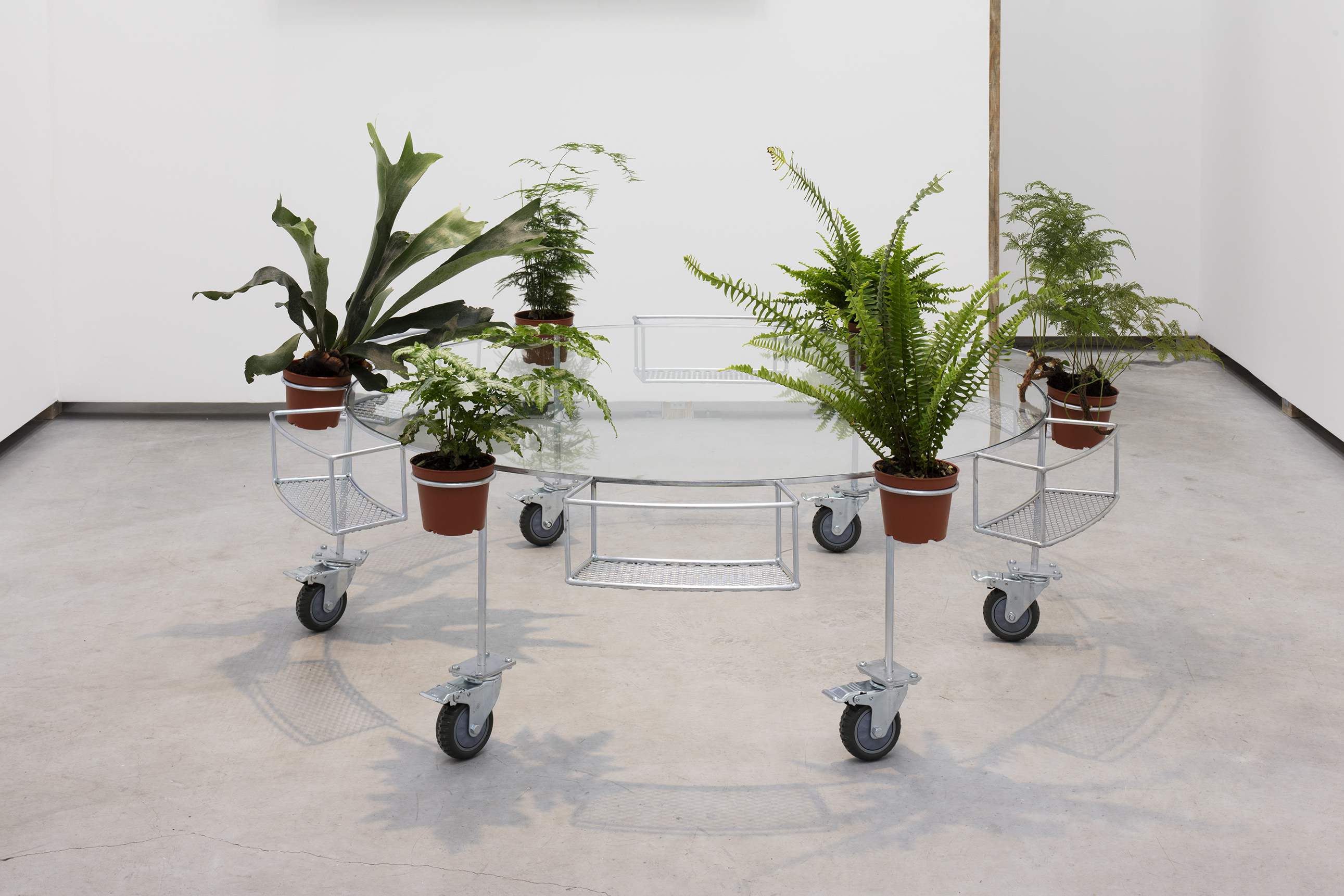APRDELESP, sala-jardín-bar, 2021. Steel, glass, plastic, wheels, ferns. 45 x 150 x 150 cm