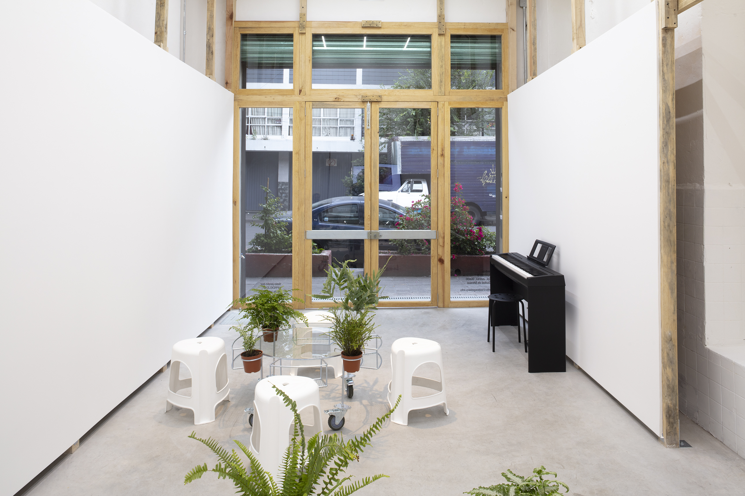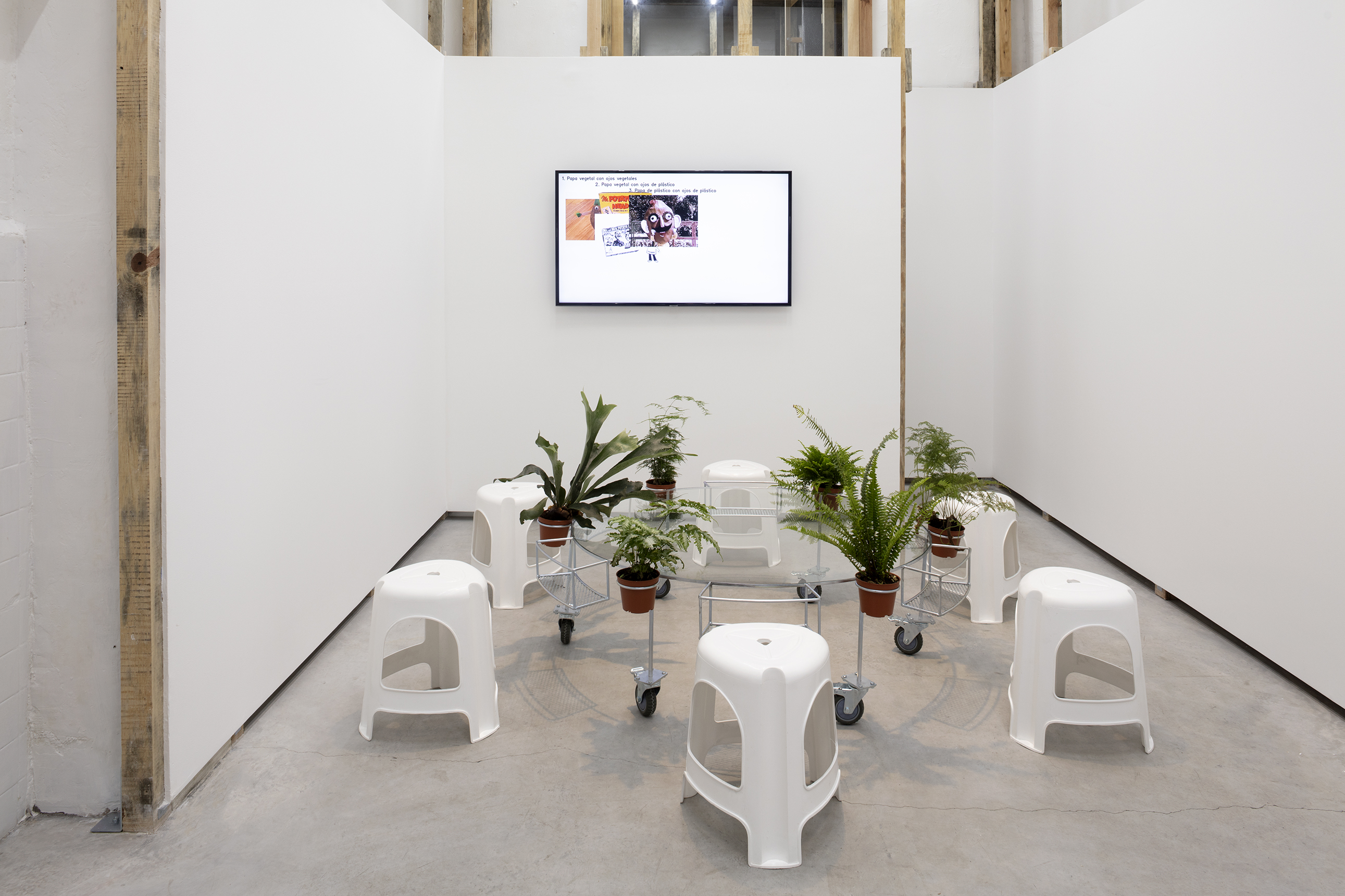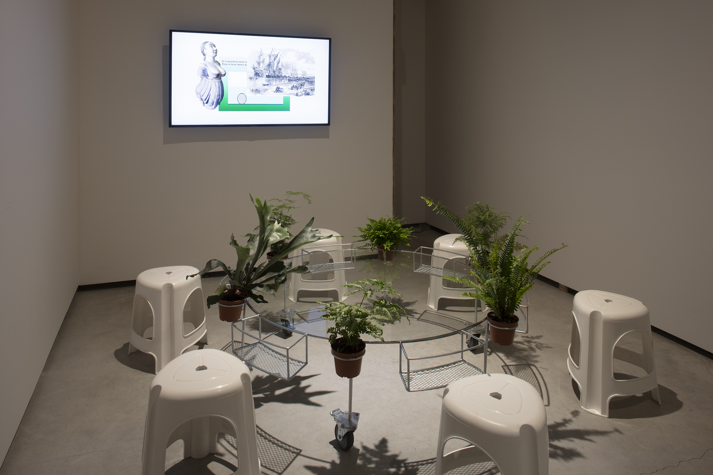 APRDELESP, sala-jardín-bar, 2021. Steel, glass, plastic, wheels, ferns. 45 x 150 x 150 cm