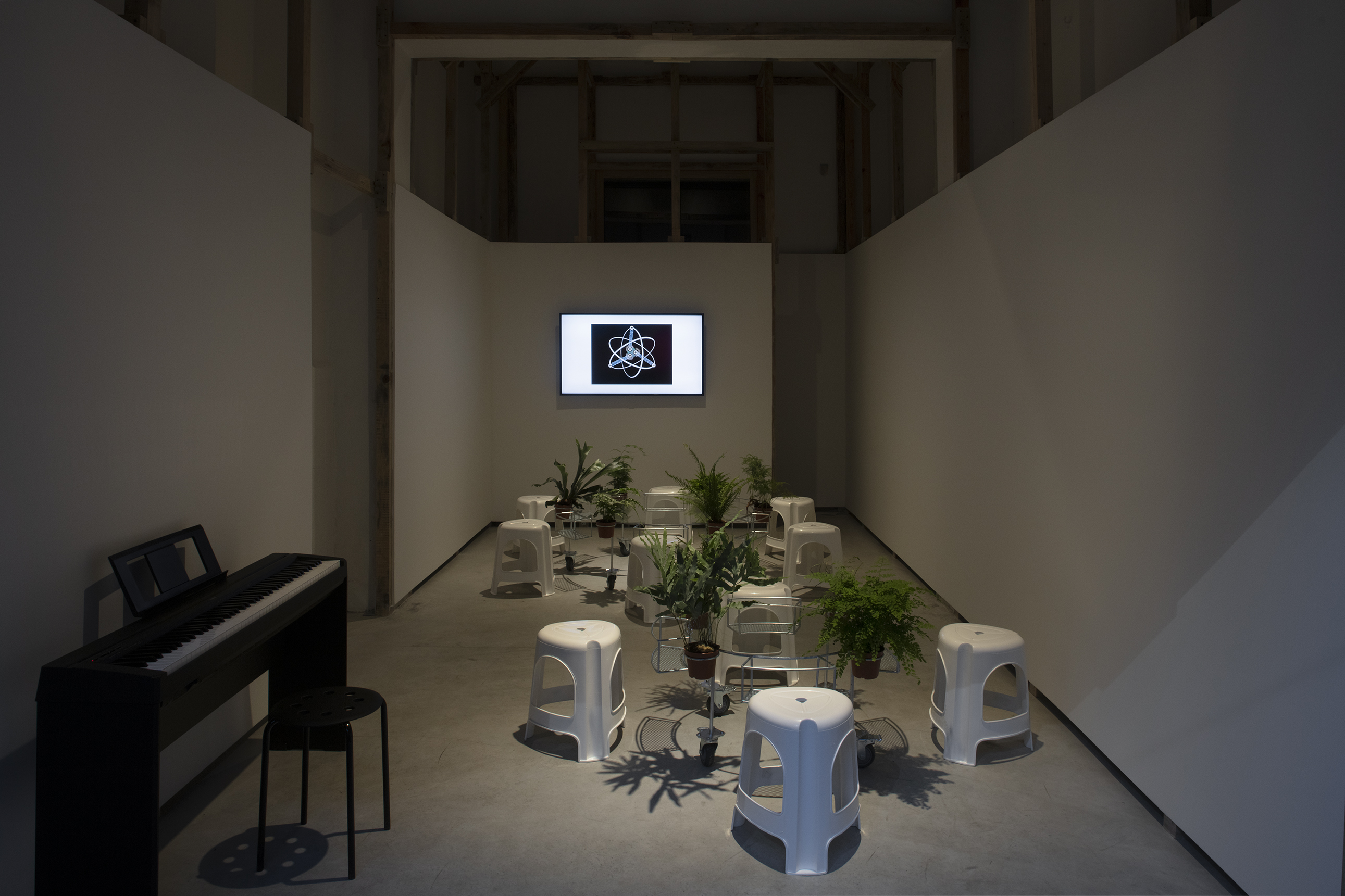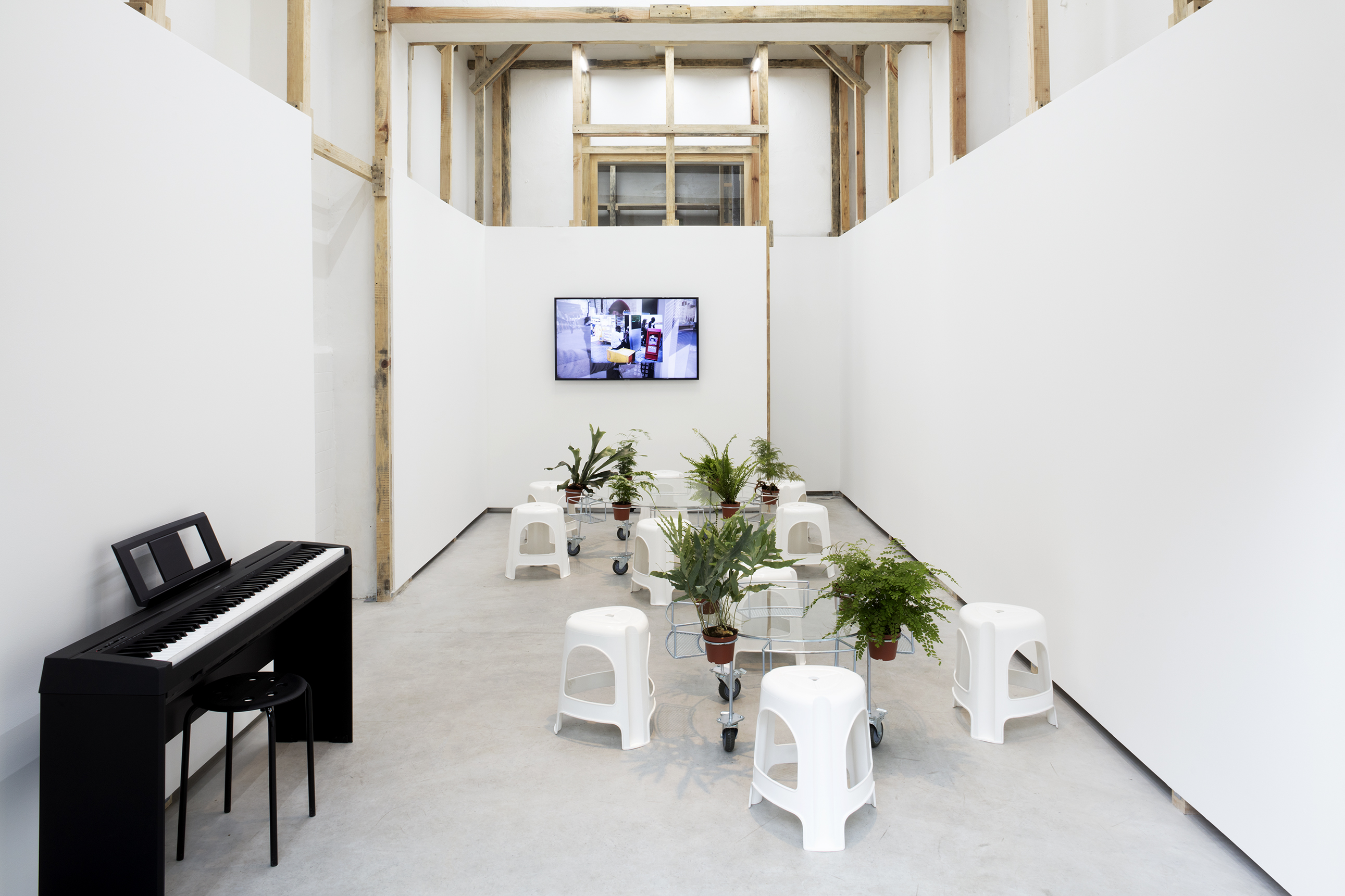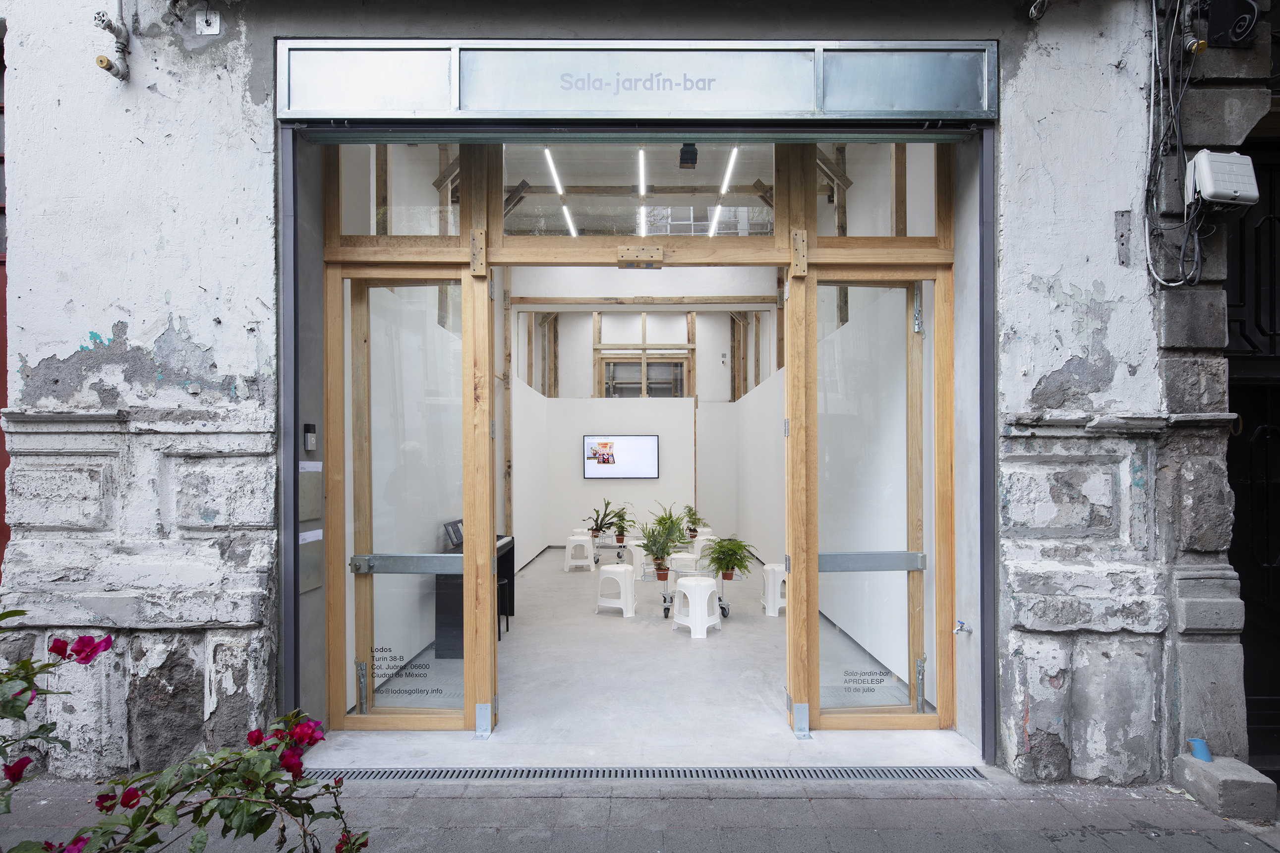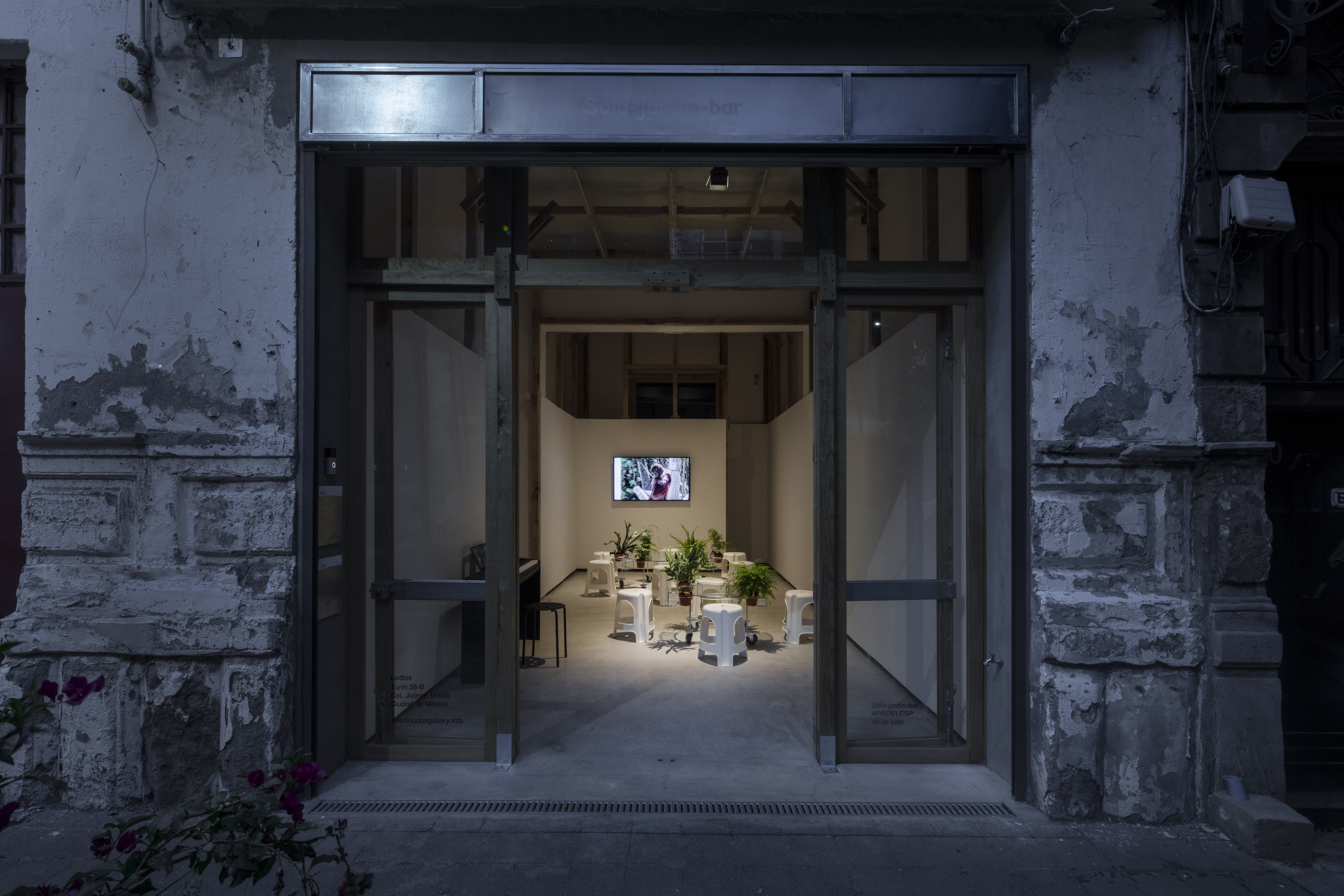 APRDELESP, sala-jardín-bar, 2021. Steel, glass, plastic, wheels, ferns. 45 x 150 x 150 cm