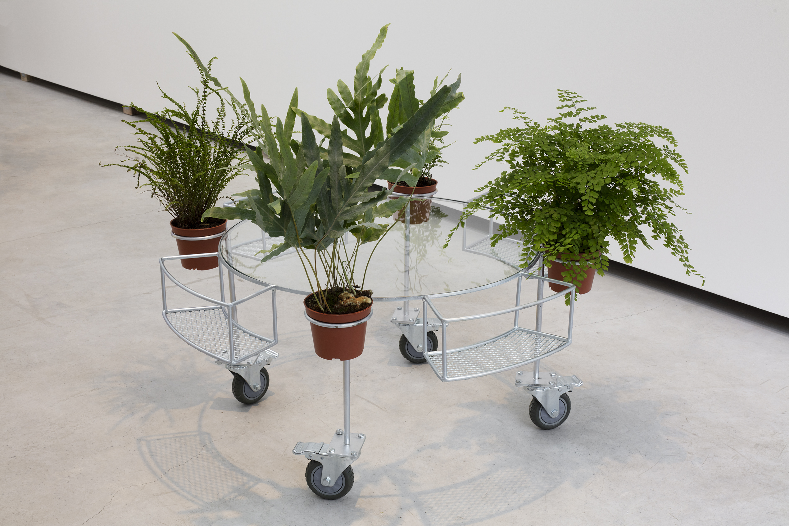 APRDELESP, sala-jardín-bar, 2021. Steel, glass, plastic, wheels, ferns. 45 x 95 x 95 cm